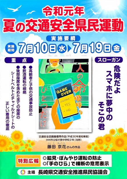明日、7月10日(水)から7月19日(金)までの10日間、夏の交通安全県民運動が実施されます