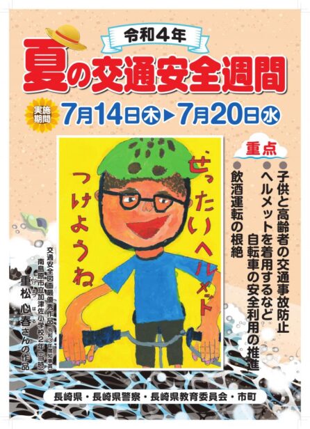 夏の交通安全週間 安全への取り組み 2022.07.14 7月14日(木)~7月20日(水)は夏の交通安全週間となっております。 重点項目として 子供と高齢者の交通事故防止 ヘルメットを着用するなど自転車の安全利用の促進 飲酒運転の根絶 安全週間が終わっても日々意識していきましょう。