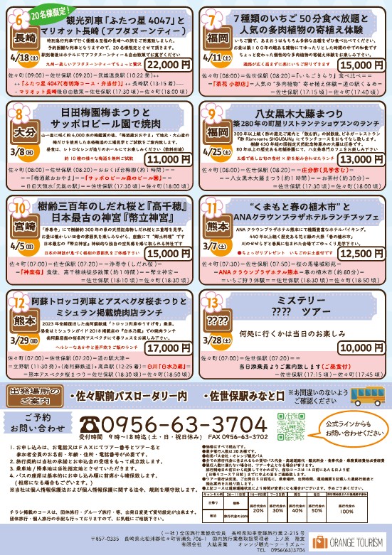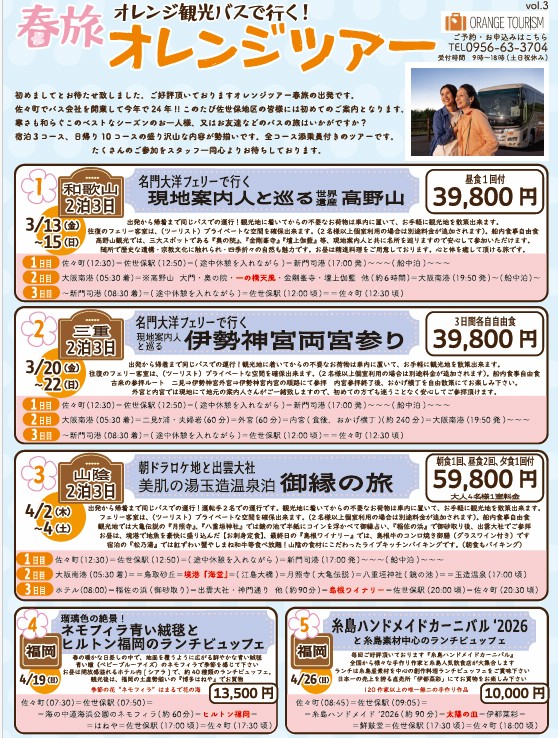 春旅へ・・・let`s go!! 未分類 2026.02.02 オレンジ観光バスで行く 『春旅 オレンジツアー』 の、始まり始まり~(^_-)-☆ ★★★是非チェックしてみてください♪★★★ 気になる旅を見つけたらぜひお電話でご予約お待ちしております(^_-)-☆