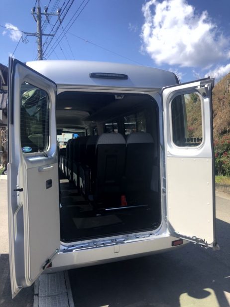 荷物重視のマイクロバス導入 お知らせ 2019.03.18 マイクロバス 17+6(補助席) 従来のマイクロバスの1番後ろのシートがなく、観音開きのドアにより、キャリーバッグなど大きな荷物を積むことができます 部活やゴルフなど用途にあった車となっております